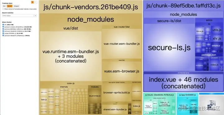 配置按成后,执行build命令,浏览器会默认打开以下页面,可以清晰的分析打包后的文件体积及组成,方便进行加载速度优化。