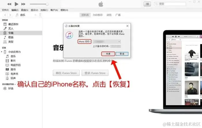确认自己备份的iPhone名称,确认无误后点击【恢复】按钮。