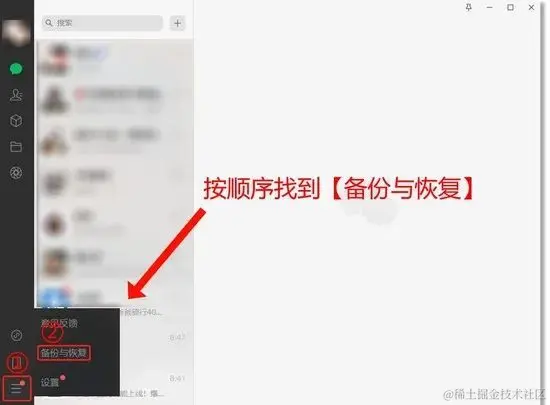 首先在电脑上登录微信,在左下角找到四条横线形状的【更多】,选择【备份与恢复】选项。
