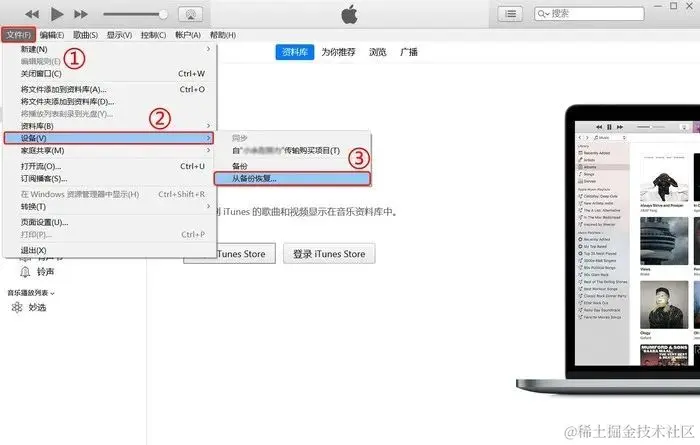 在电脑上下载iTunes后将用数据线将iPhone和电脑连接起来,iTunes会扫描到我们的手机,若提前备份过,可以在【文件】-【设备】中找到【从备份恢复】选项。
