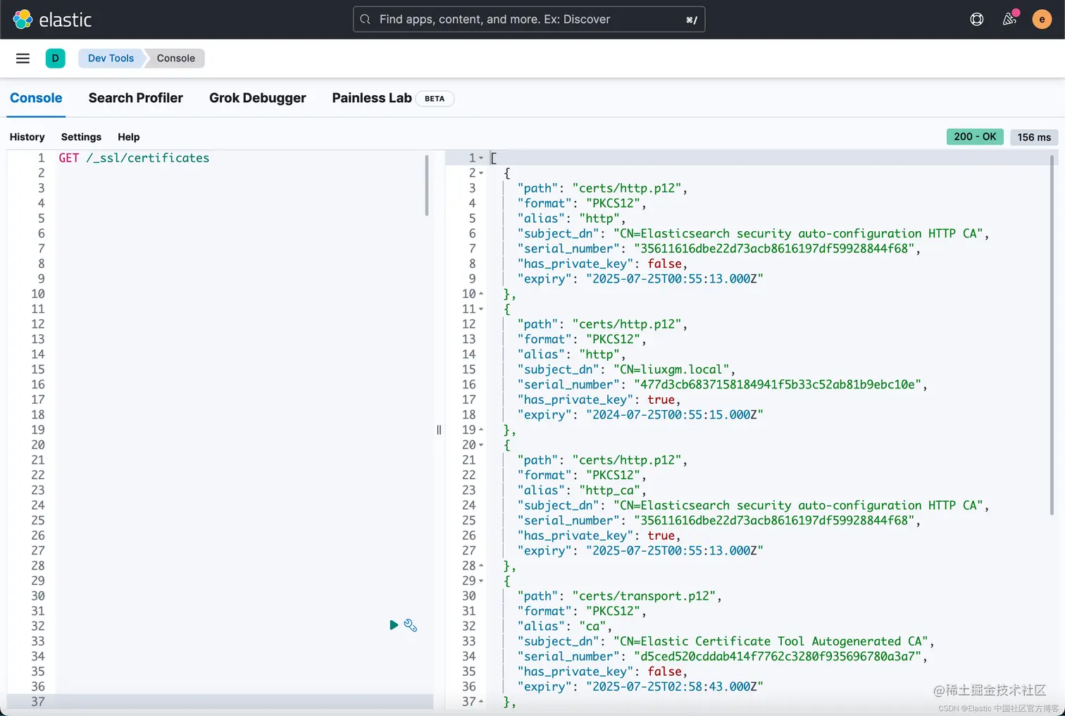 6)(可选)使用 SSL 证书 API 来验证 Elasticsearch 是否加载了新的密钥库。