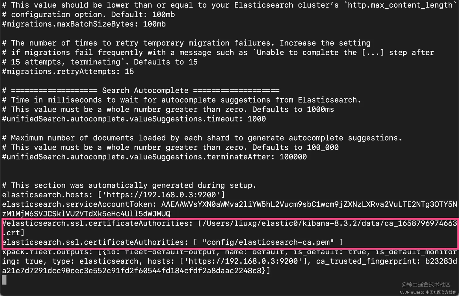 2)如果你修改了 elasticsearch-ca.pem 文件的文件名,请编辑 kibana.yml 并更新配置以指定 HTTP 层的安全证书的位置。