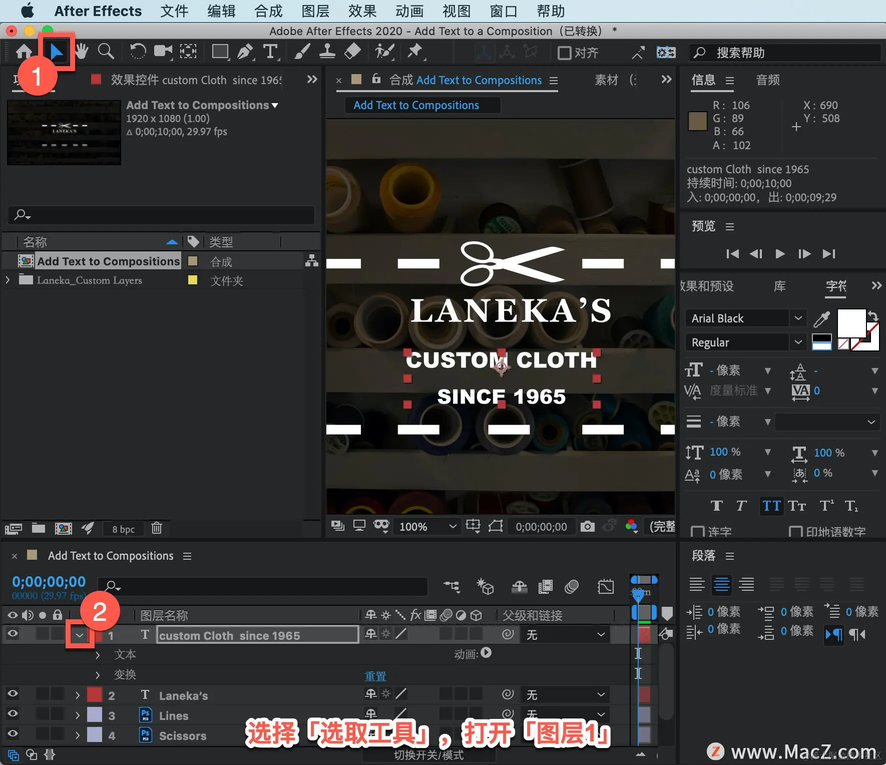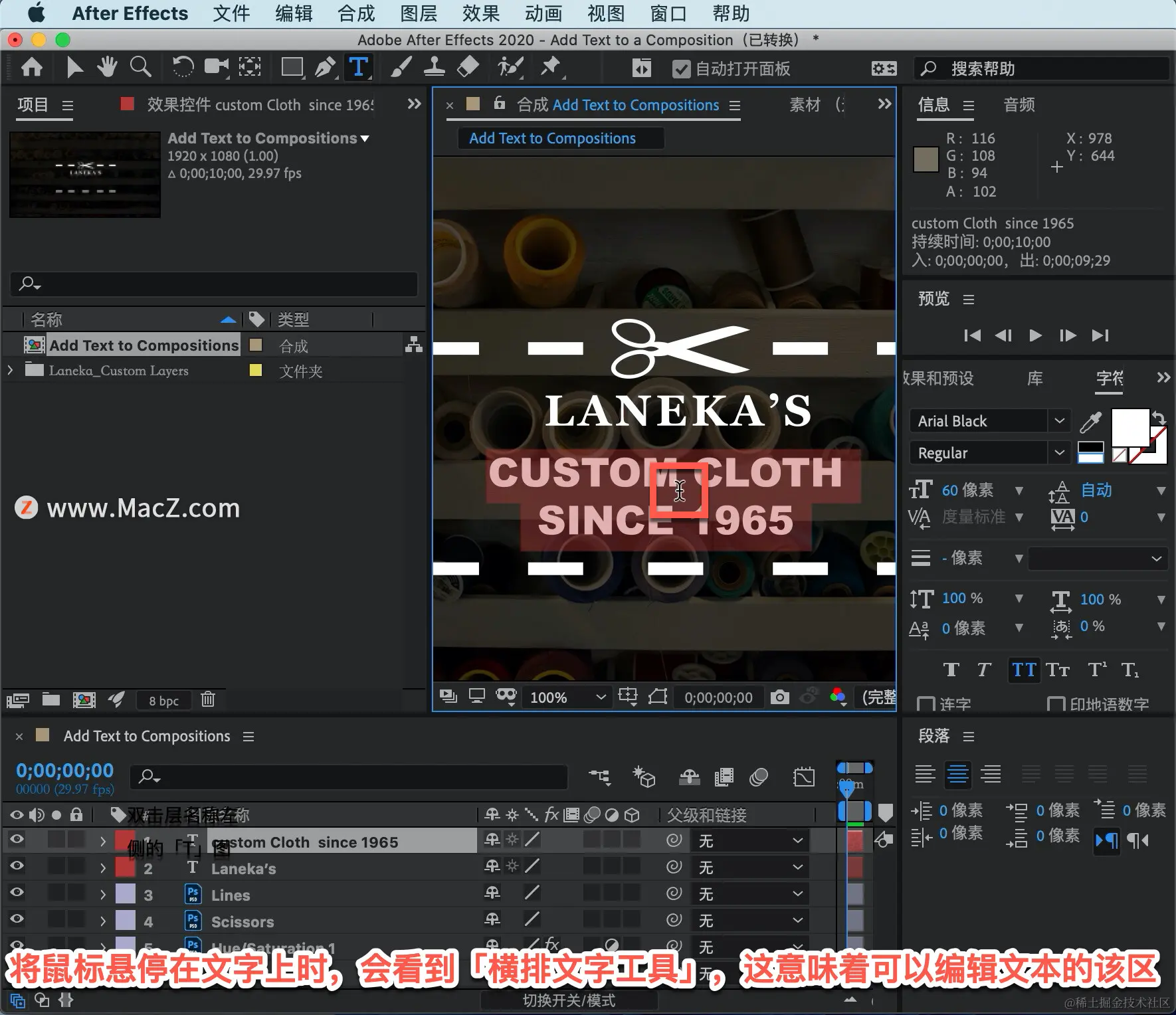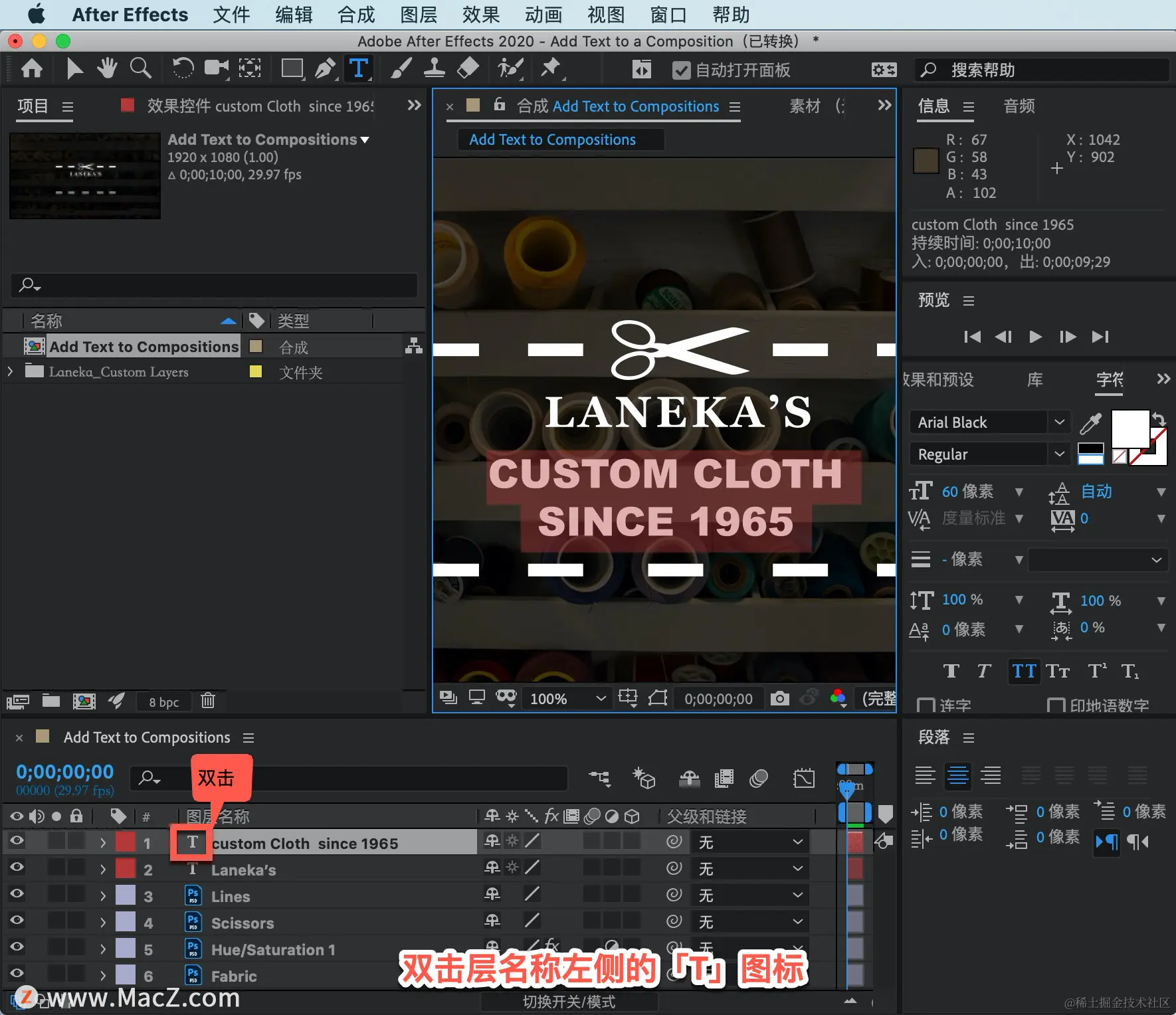 要在单个文本层中自定义不同的类型行,转到「时间轴」,双击层名称左侧的「T」图标,双击后将看到文本现在在合成面板中高亮显示。