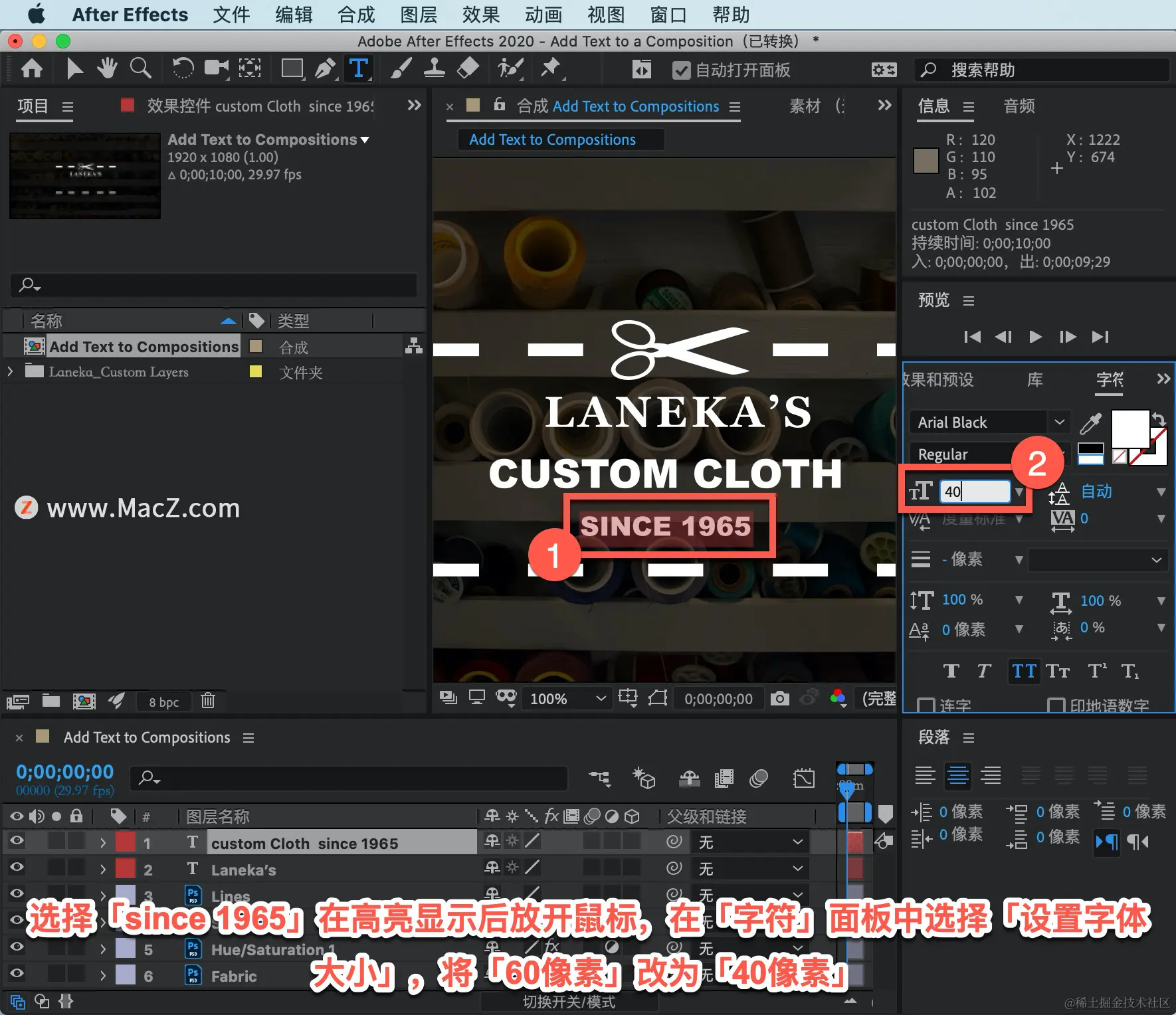 更改选择的文本,选择「since 1965」在高亮显示后放开鼠标,在「字符」面板中选择「设置字体大小」,将「60像素」改为「40像素」。