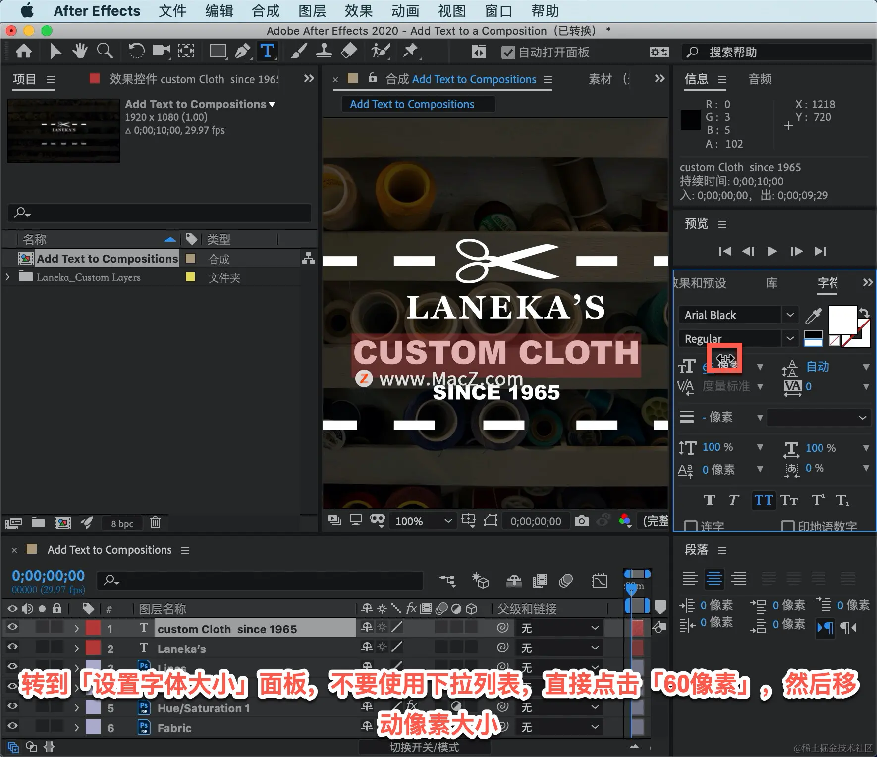 选中后,将这一行字体缩小一点,转到「设置字体大小」面板,不要使用下拉列表,直接点击「60像素」,然后移动像素大小。这是一个很好的方式来微调您的类型布局。