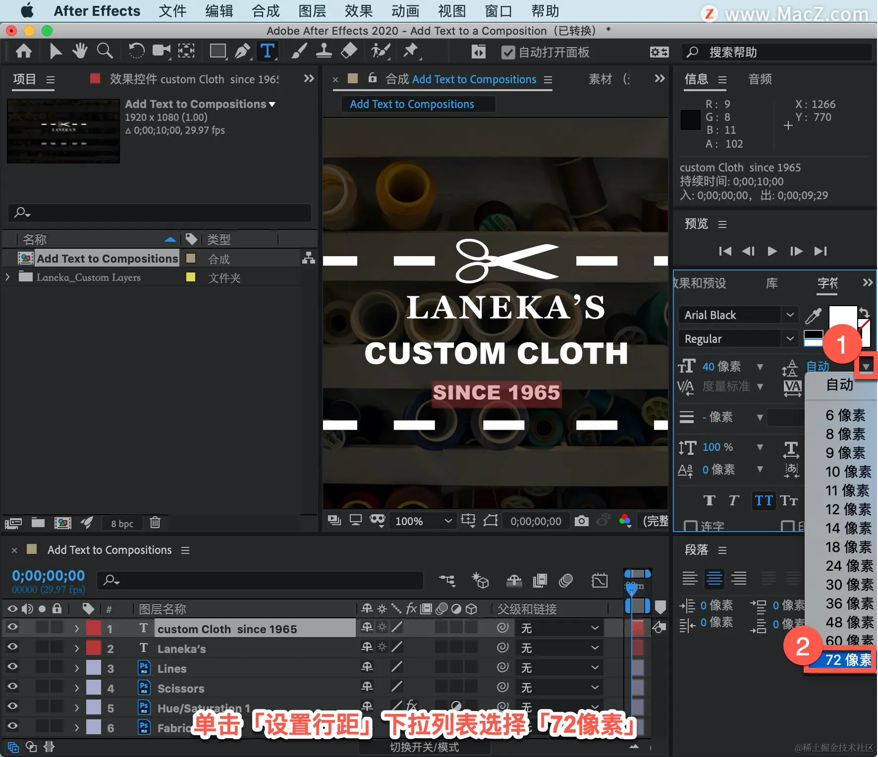 单击「设置行距」下拉列表选择「72像素」,这将在不同元素之间有更多的空间。