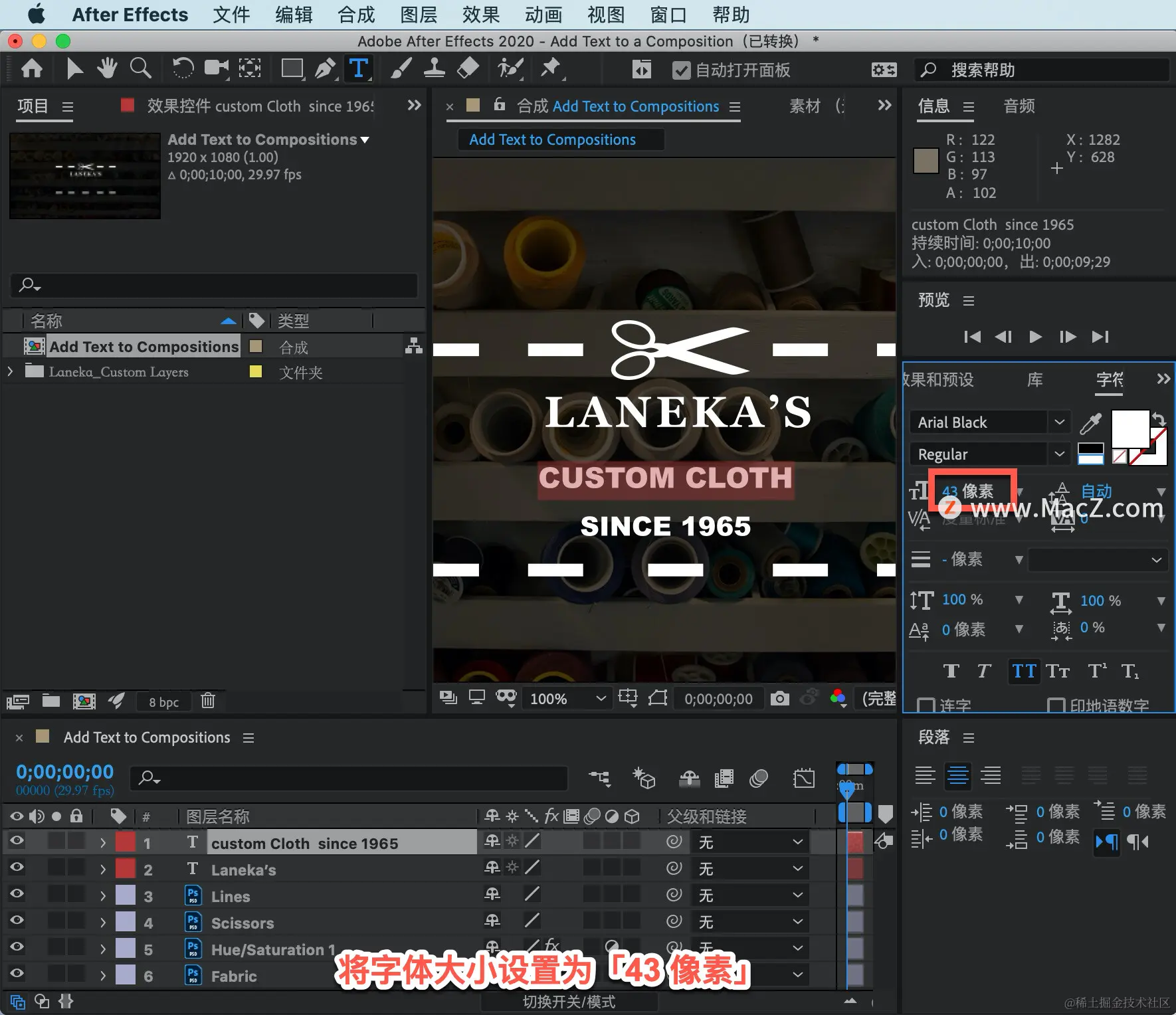 将字体大小设置为「43 像素」。