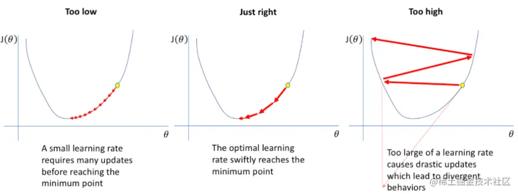 - 相反,小的学习率(在左边),对权重的更新很小,这将引导优化器逐渐走向最小值。然而,优化器可能需要太长的时间来收敛,或者卡在高原或不希望出现的局部最小值。