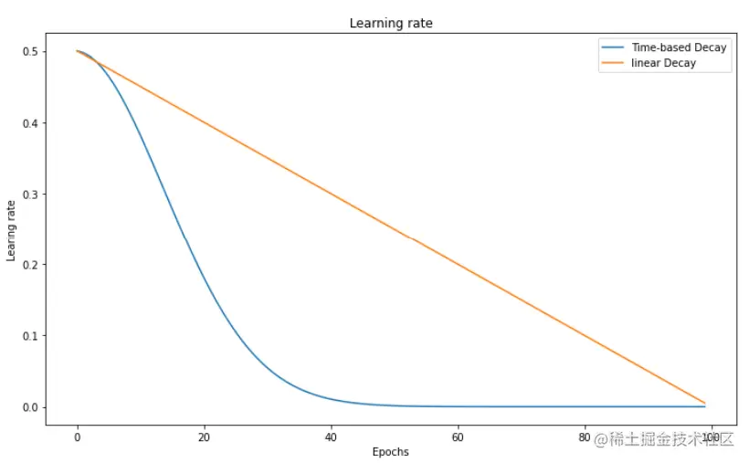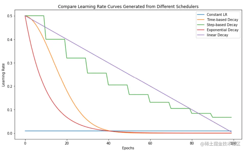 同样,指定initial_learning_rate = 0.5和epochs = 100将产生以下衰减曲线(与线性和基于时间的衰减相比)。