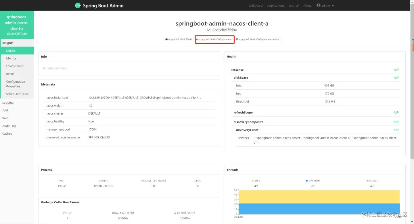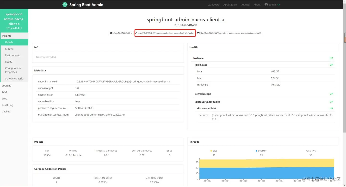 启动springboot-admin-nacos-client-a后,刷新以上两个页面: