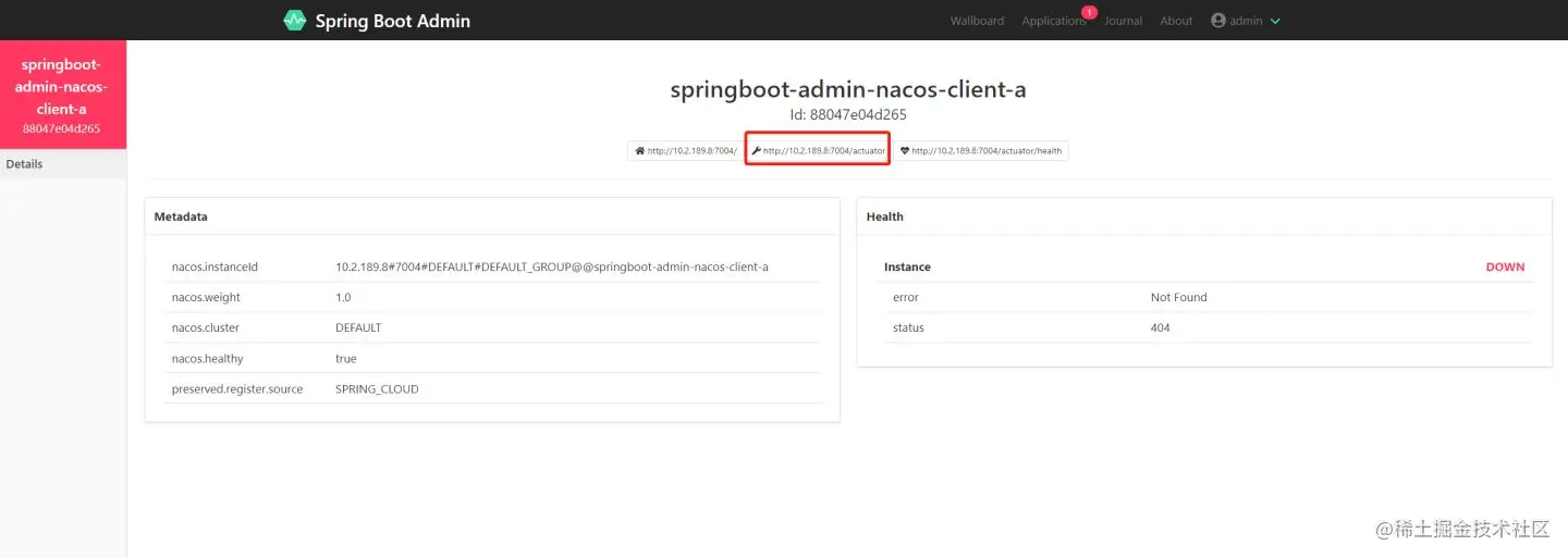 1、服务已启动,成功注册到Nacos,但在Admin中是DOWN状态。