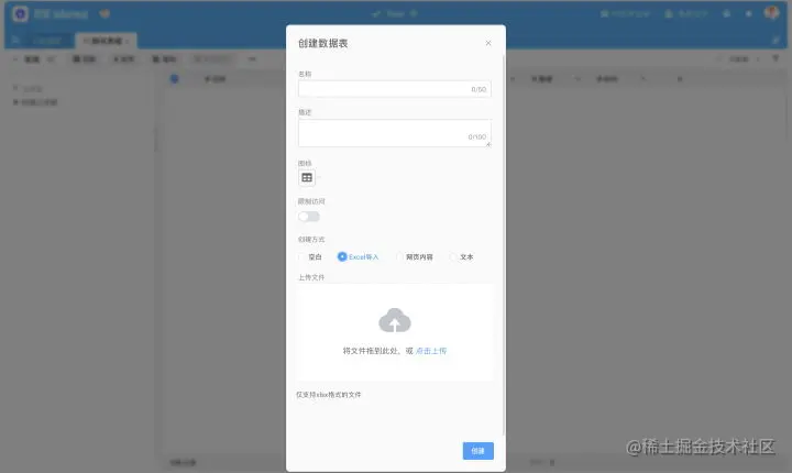 跟Excel有些类似,进入应用后,我们首先要创建数据表,也可以创建知识库、文件存储、仪表盘等内容。(创建数据表时,支持Excel、文本、网页内容的数据导入)