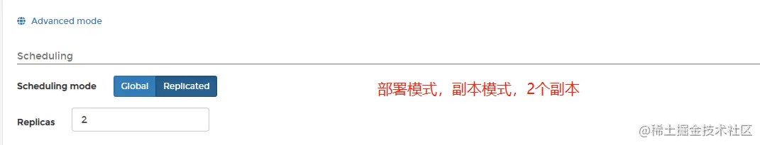 - --mode:部署模式 (replicated or global)(默认"replicated"),global模式会在可部署的节点有且仅部署一个容器。