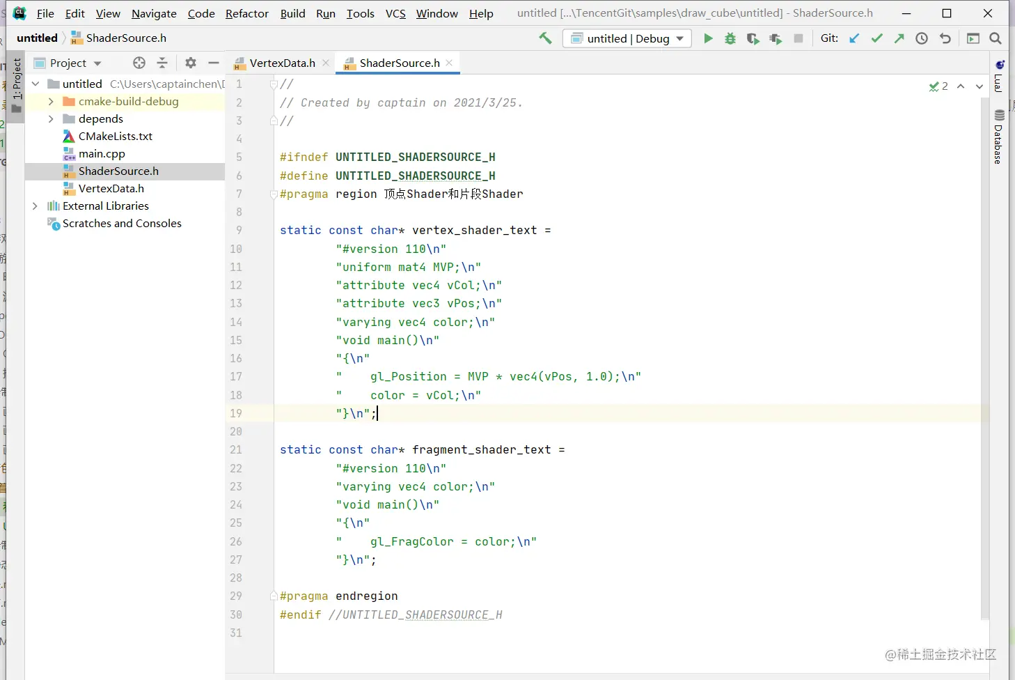 在 3.绘制简单图形 这一章的配套项目里,ShaderSource.h 里面就存放着Vertex Shader 和 Fragment Shader 的源码。