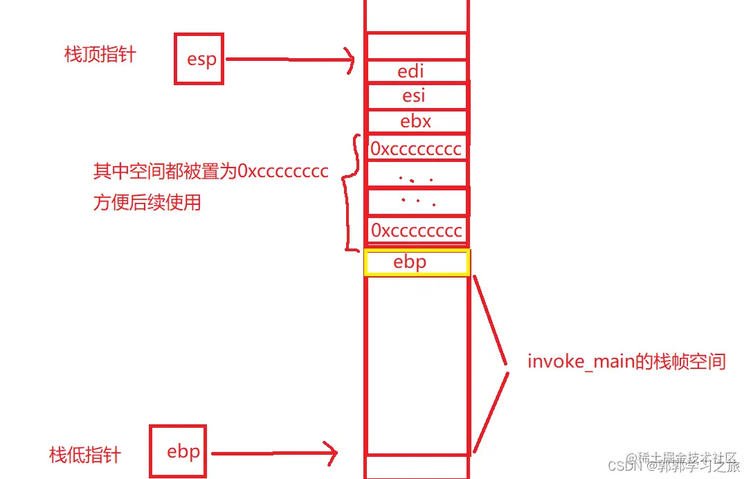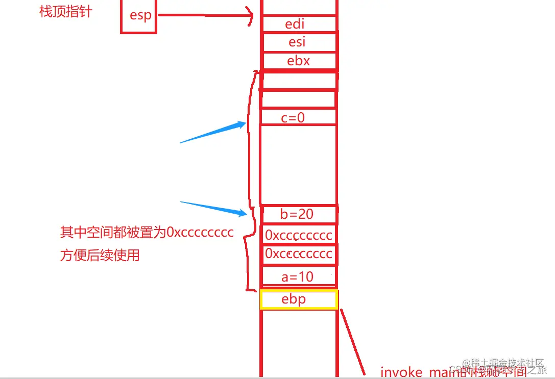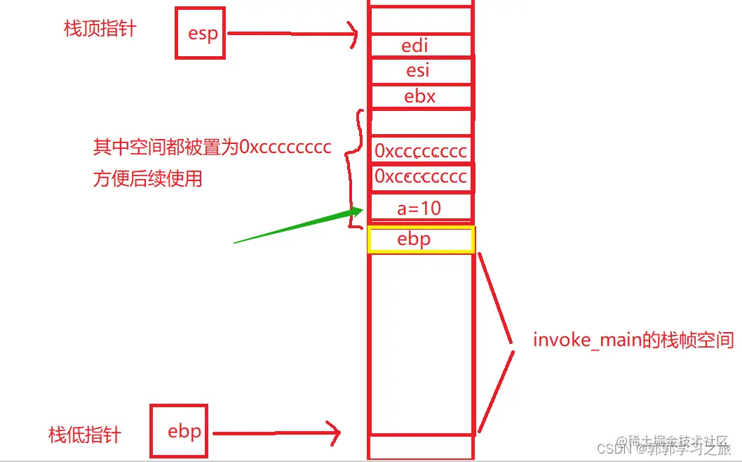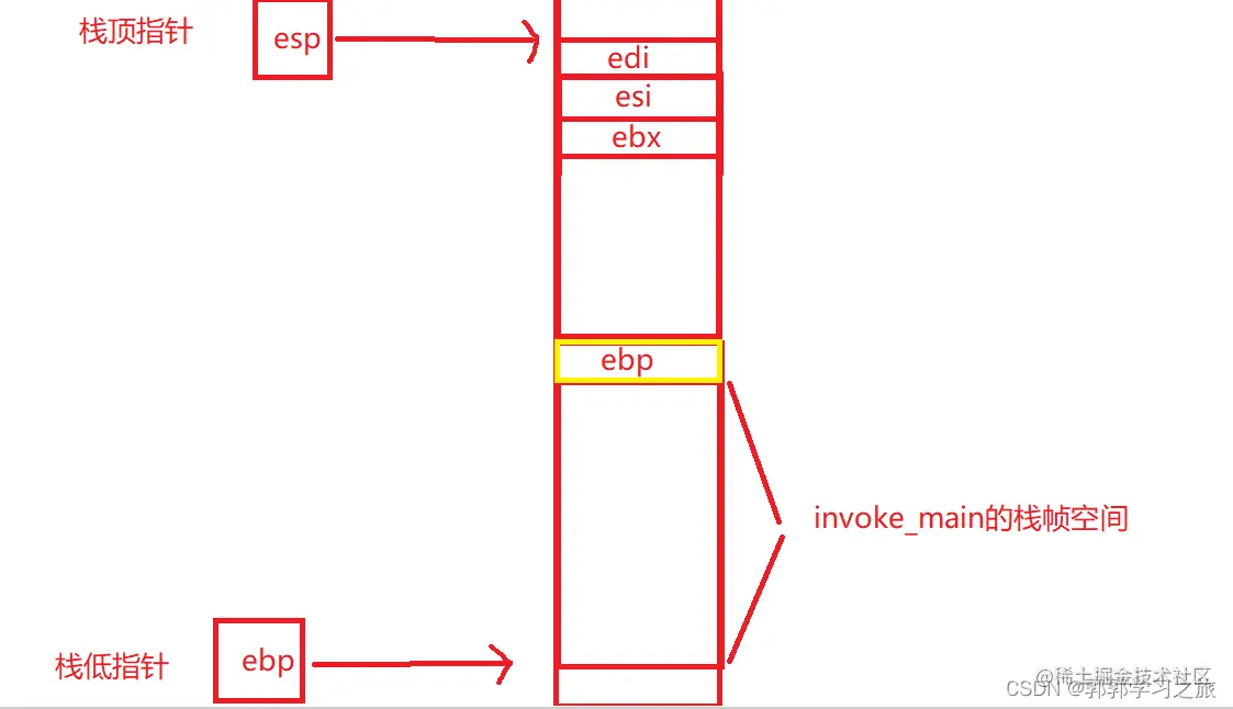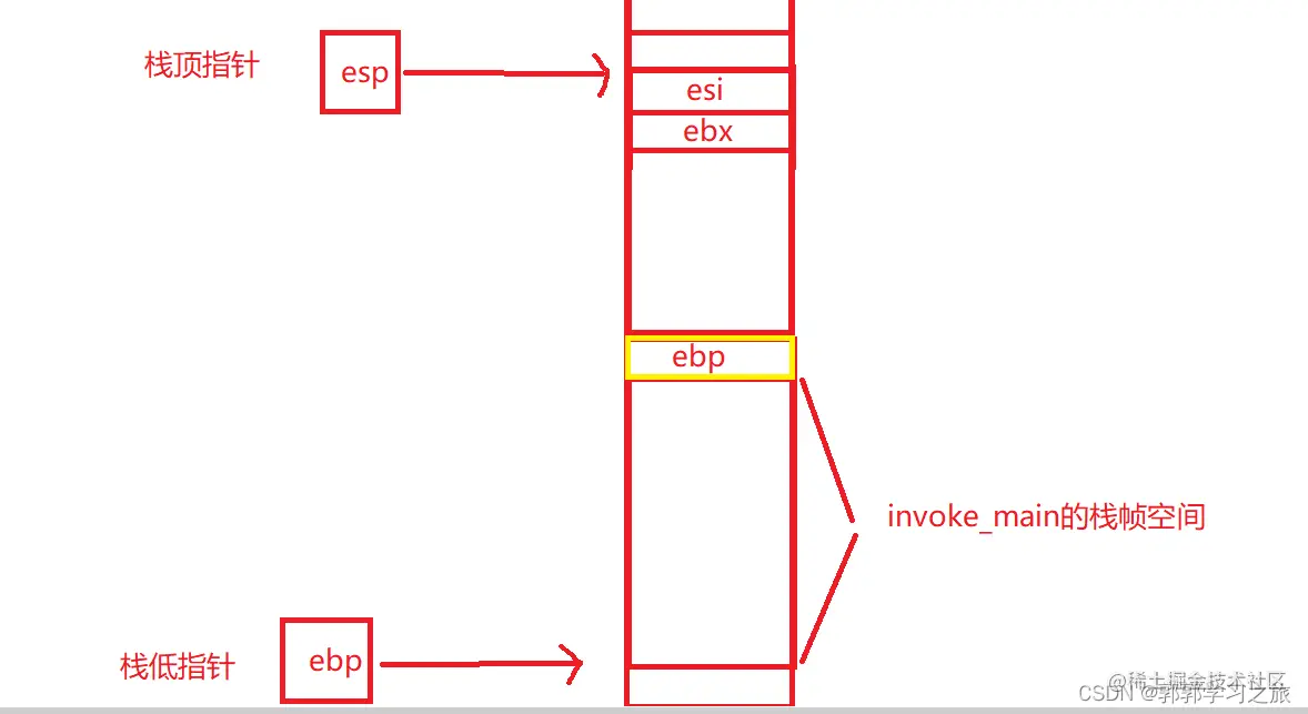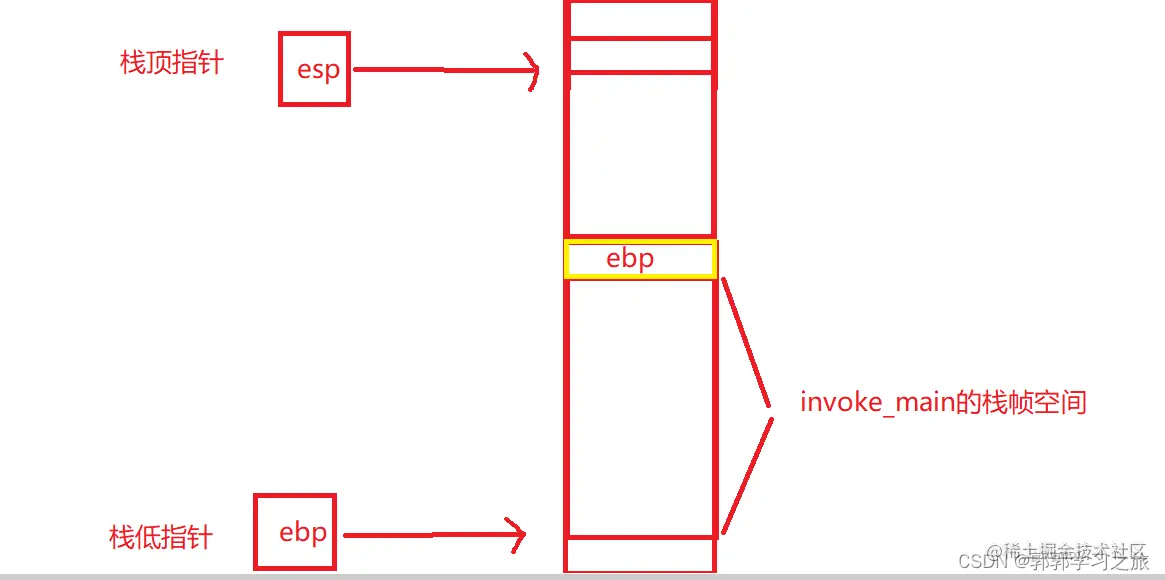 我们可以看到, main 函数调用之前,是由 invoke_main 函数来调用main函数。那我们可以确定, invoke_main 函数应该会有自己的栈帧, main 函数和 Add 函数也会维护自己的栈 帧,每个函数栈帧都有自己的 ebp 和 esp 来维护栈帧空间。