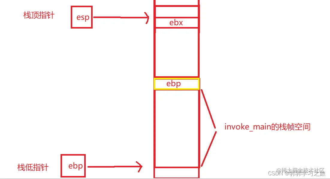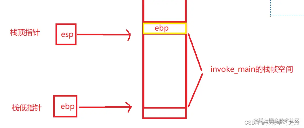 push ebp //把ebp寄存器中的值进行压栈,此时的ebp中存放的是invoke_main函数栈帧的ebp,esp-4