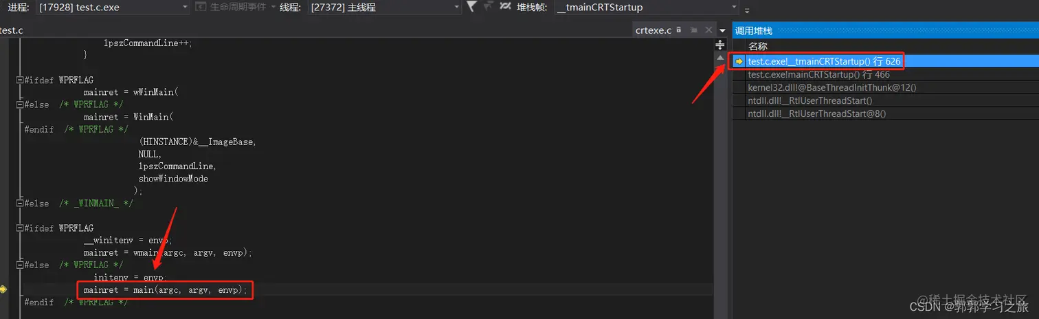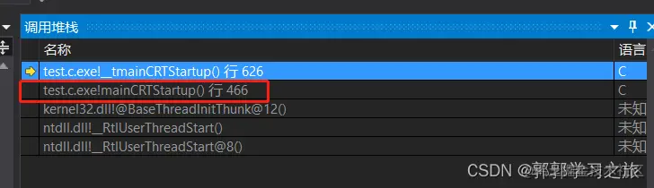 然后我们按下F10,并且打开调试的堆栈窗口可以发现,main函数被调用起来了