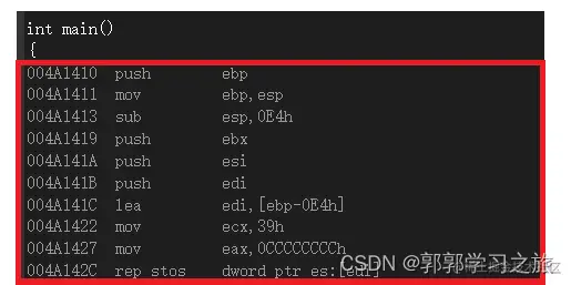 sub esp,0E4h //sub会让esp中的地址减去一个16进制数字0xe4,产生新的esp,此时的esp是main函数栈帧的esp,此时结合上一条指令的ebp和当前的esp,ebp和esp之间维护了一个块栈空间,这块栈空间就是为main函数开辟的,就是main函数的栈帧空间,这一段空间中将存储main函数中的局部变量,临时数据已经调试信息等。