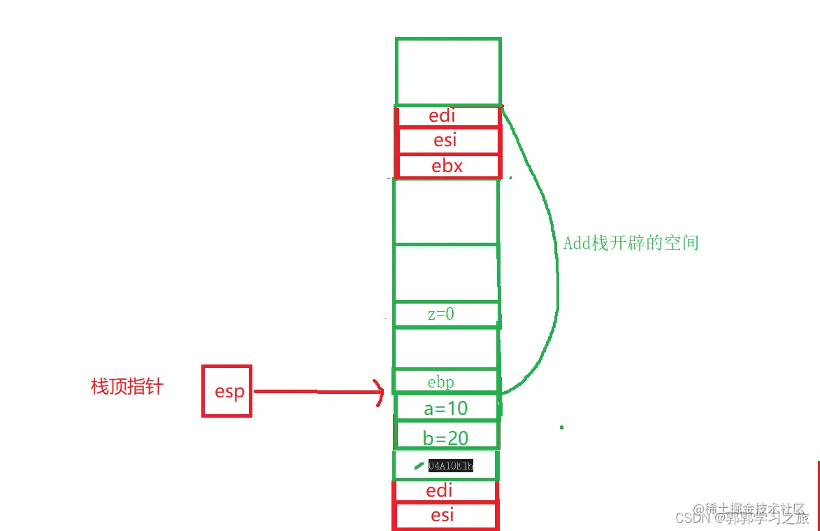 在Add函数中创建栈帧的方法和在main函数中是相似的,在栈帧空间的大小上略有差异而已。