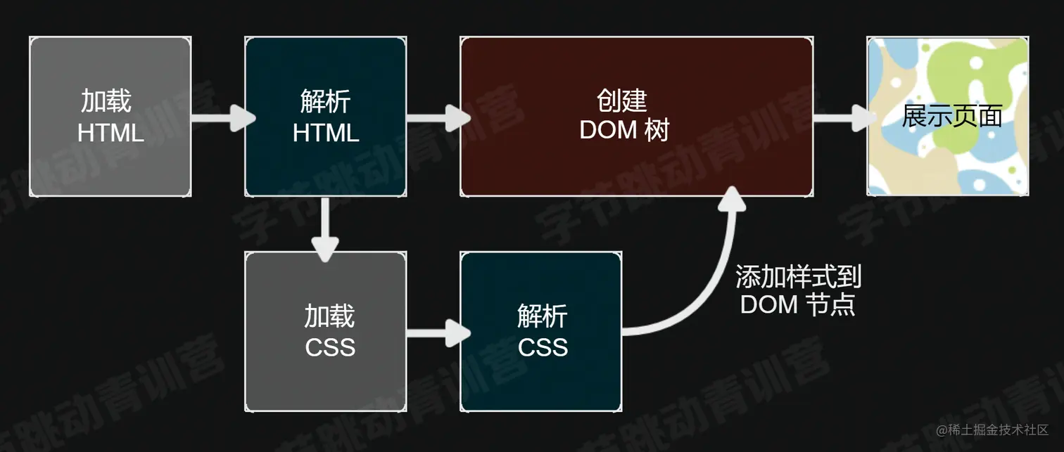如图所示,计算机从上至下加载HTML文件并进行解析后产生DOM树,并在解析HTML后加载解析CSS文档,接着将解析后的CSS样式赋给DOM树中的对应元素,最后在浏览器中展示出来。