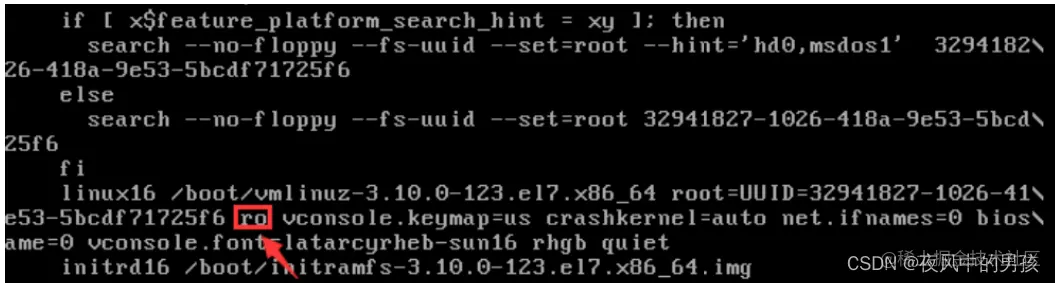 在linux16这一行中找到ro,将ro改变为rw,并在结尾添加init=/bin/sh