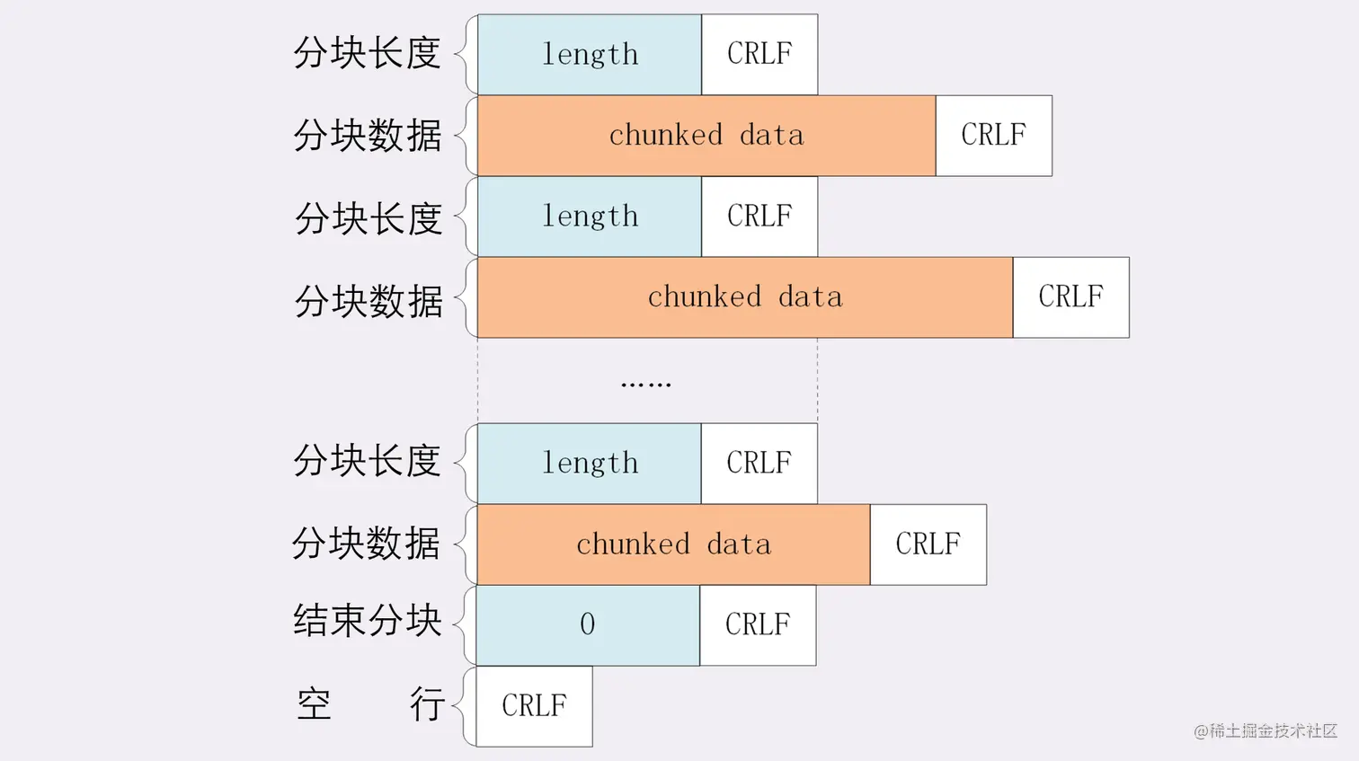 注意:HTTP/2 中已经不支持 chunked 这一格式了,因为其本身提供了更加高级的流机制来实现类似功能。