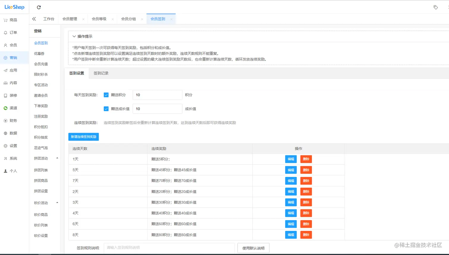 而营销的方式也是多种多样,有会员签到、优惠卷、限时秒杀、下单奖励、积分抵扣、拼团活动、砍价活动等多种多样。