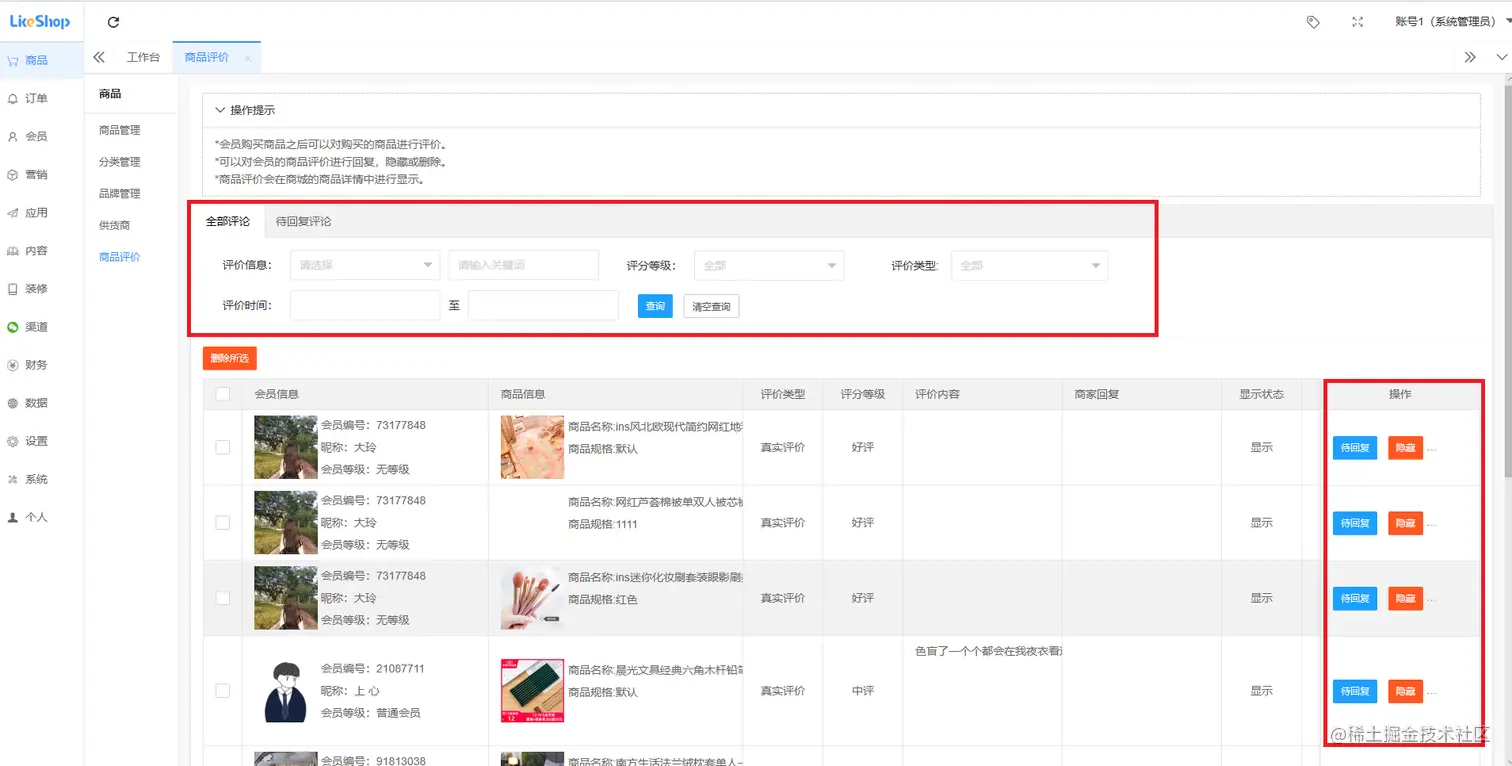 - 商品评价:用户购买商品后对商品的评价,商家可以在后台查询并回复、删除或者隐藏该用户的评价