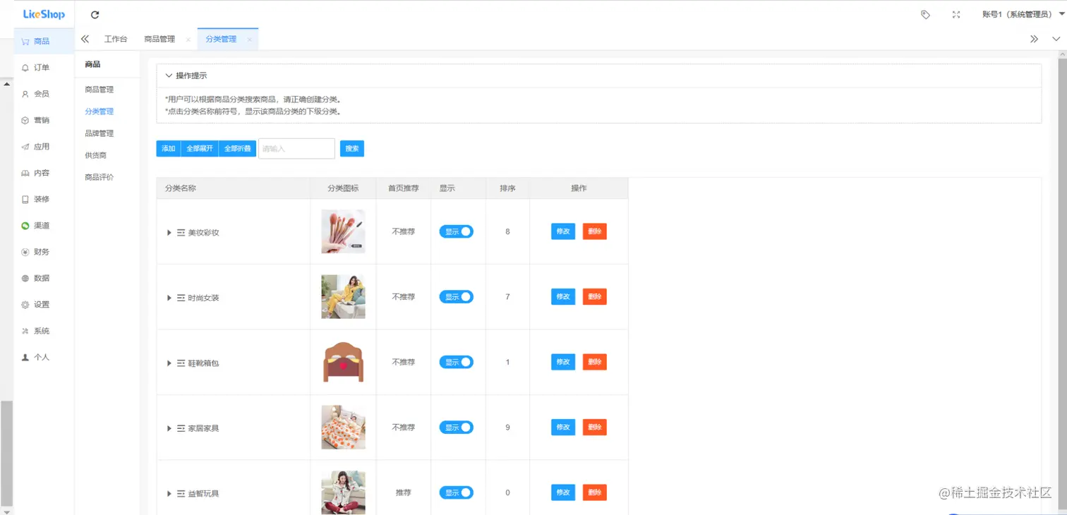 - 分类管理:将商品进行分类,方便商家消费者查找,同样可以添加、删除、修改分类