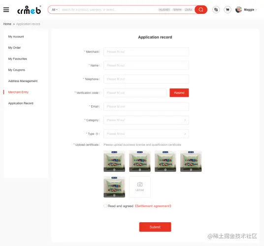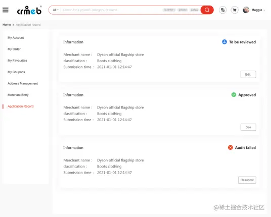 支持商户自行申请入驻,商户向平台提交申请资质,平台审核通过商户即可入驻商城,同时所有申请过程还会形成记录可供查询。