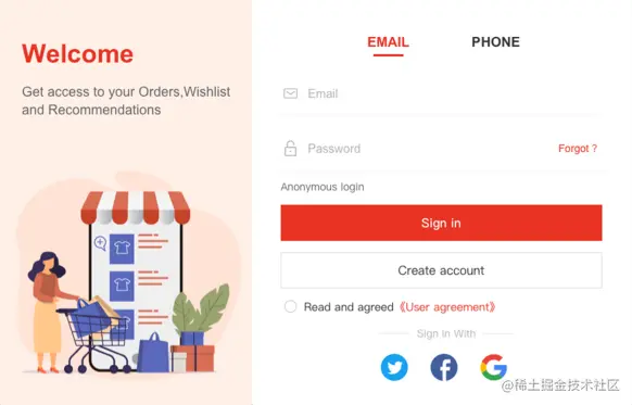 系统具备 6 种登录方式,支持邮箱账号、手机号、Twitter、Facebook、Google 及匿名登录。