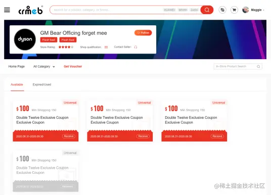 (3)系统设置有商户优惠券,用户可领取使用商户优惠券,让平台店铺营销更具吸引力。