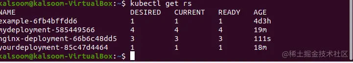 执行kubectl get rs来查看部署所建立的复制集(rs)。随后显示的图像是输出的一个样本。