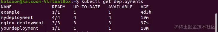 命名空间中的部署的名称被列在 "NAME "类别中。用户可访问的应用程序的副本数量显示在 "READY "类别中。它保持了就绪/期望模式。为达到目标状态而被修改的副本数量显示在 "UP-TO-DATE "类别中。"AVAILABLE "类别显示你的用户可以访问多少个应用程序的副本。AGE "类别字段显示应用程序已经运行了多长时间。执行附件中的命令来查看部署展开的状态。