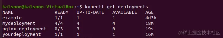 如果你得到这样的输出,说明部署仍在生成过程中。等待几秒钟,再重新运行kubectl get命令。这就是结束后的最终结果的样子。