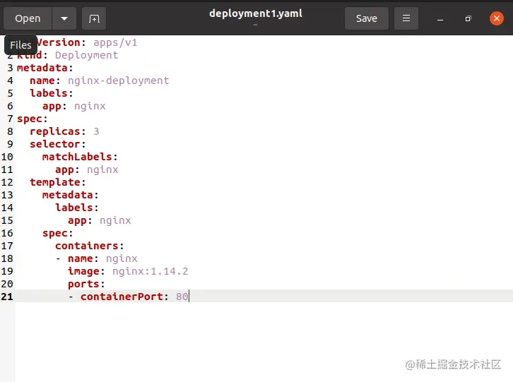 metadata.name "属性表示建立了一个名为Nginx-deployment的部署。".spec.replicas "属性表明,该部署产生三个复制的Pod。字段".spec.selector "指定了部署如何决定维护哪些Pod。在这种情况下,你将从Pod模板中选择一个标签(应用:Nginx)。更复杂的选择规则是可行的,只要Pod模板直接符合标准。在Ubuntu终端运行随后的命令来生成部署。