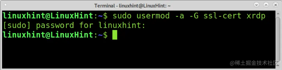 XRDP的安装过程将在你的系统中添加用户xrdp。为了允许认证,你需要将xrdp用户添加到ssl-cert 组中。你可以使用usermod命令来实现这一点,如下面的截图所示。