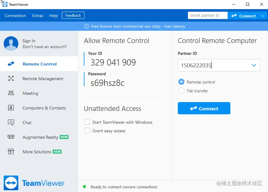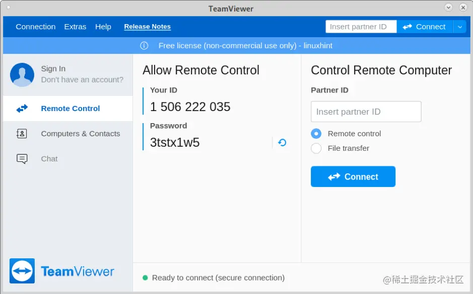 TeamViewer将显示出来。在 "合作伙伴ID"区域,输入Linux设备上TeamViewer显示在 "你的ID"部分的代码。