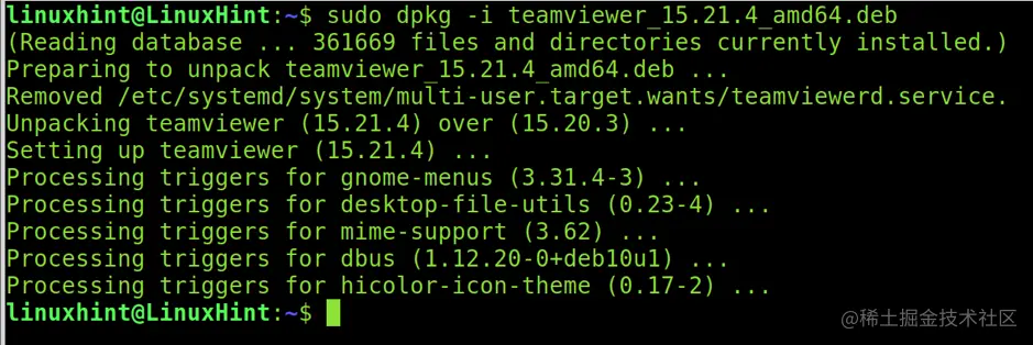 下载后,通过运行下面的命令安装teamviewer。记住把 "teamviewer_15.21.4_amd64.deb "替换成你合适的文件名或正确的版本。