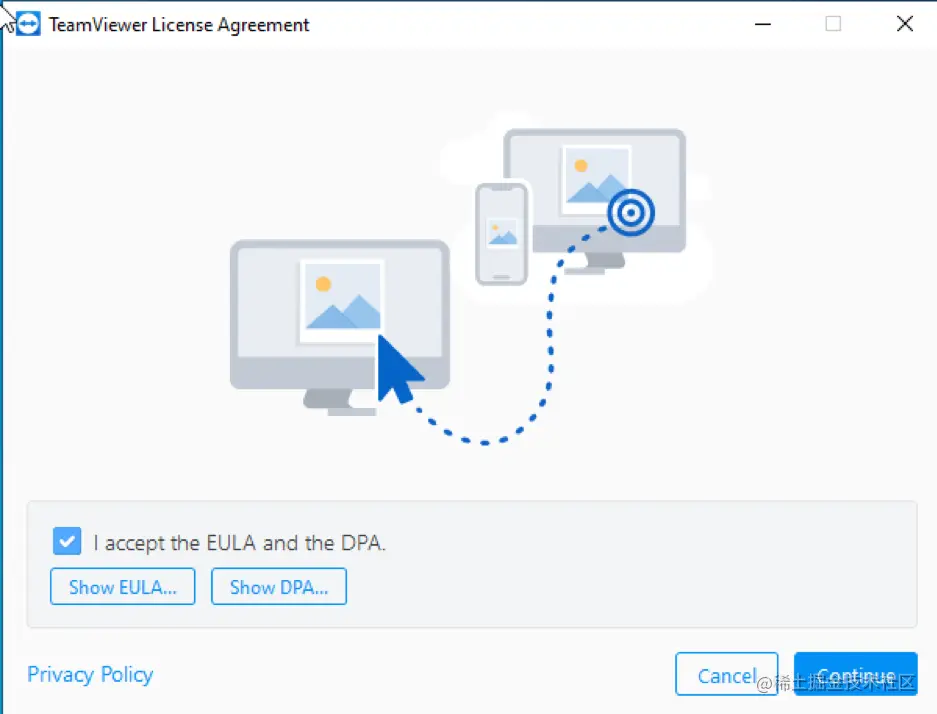在下一个窗口,标记 "我接受EULA和DPA "框,然后按 "继续"。
