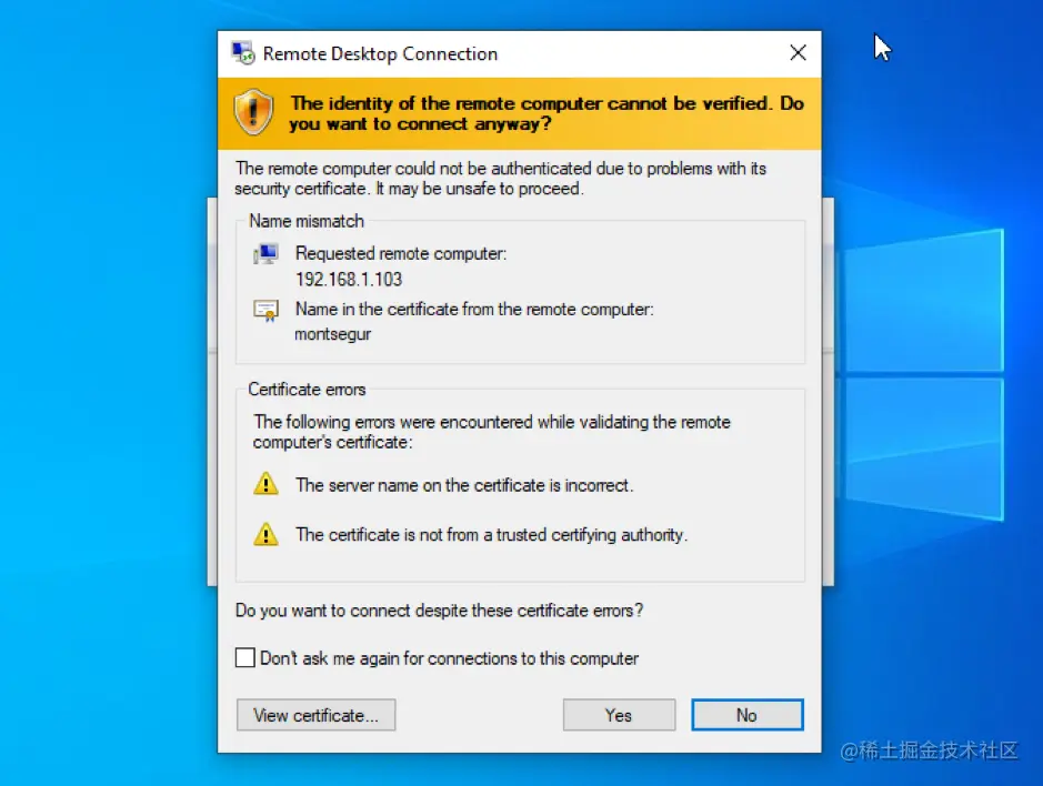 当尝试连接时,你会看到一个警告。如果你不希望警告再次出现,你可以勾选 "不要再要求我连接这台电脑",然后按 "是"按钮继续。