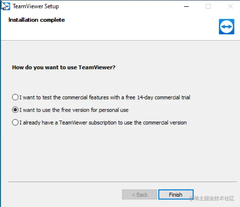 当被要求时,选择 "我想使用个人使用的免费版本"选项并按 "完成"按钮。