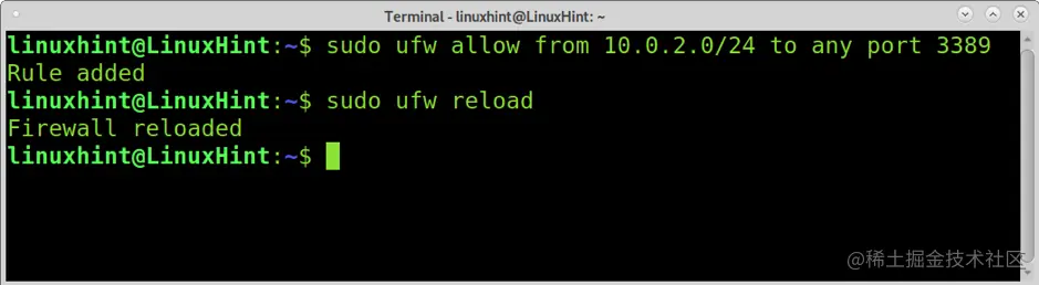 XRDP使用3389端口。在安装XRDP之前,你需要打开这个端口。你可以使用UFW(非复杂防火墙)打开该端口,如下例所示。用你的网络地址替换IP地址。