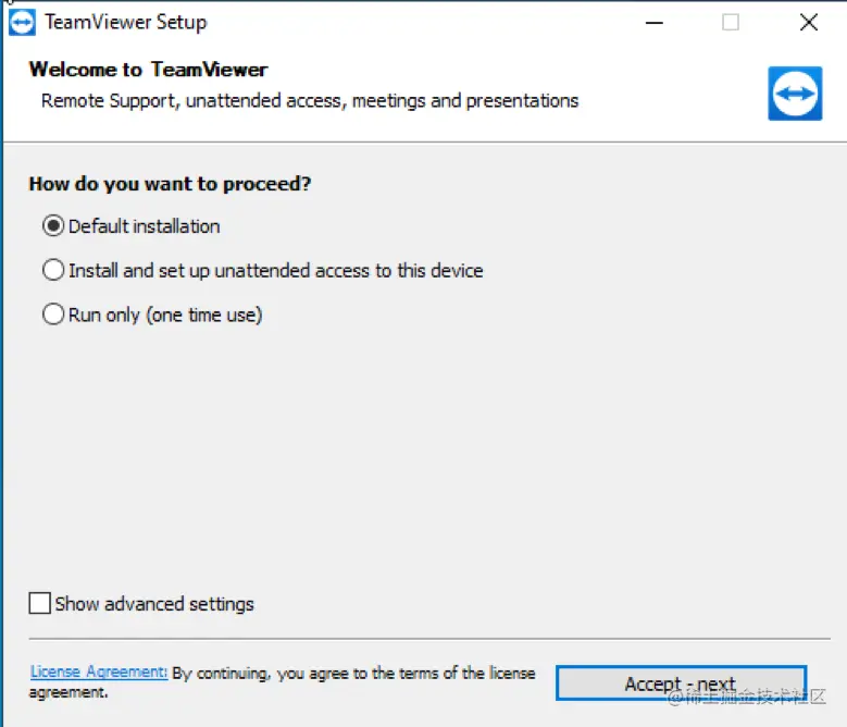 如果安装程序没有自动启动,运行它并选择 "默认安装",如下图所示,然后按 "接受-下一步"按钮。