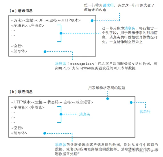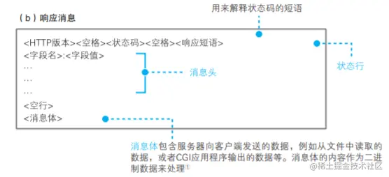 发送请求消息后,Web服务器会返回响应消息。响应消息的格式和请求消息基本上是相同的,差别在第一行上。