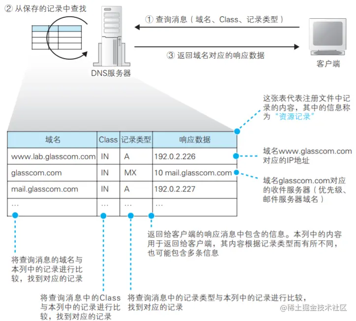 不同的记录类型对应的返回信息也会不同。DNS服务器事先保存了这3中信息对应的响应数据,当查询消息中的数据全部匹配时,会将对应的响应数据返回给客户端。