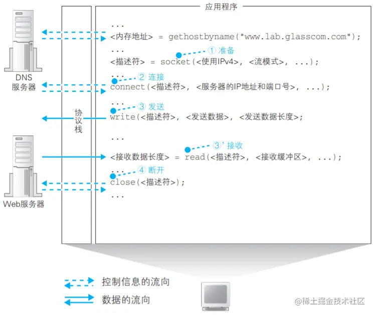 通信阶段需要使用Socket库中的write程序组件。首先应用程序要在内存中准备好要发送的数据(HTTP请求消息),调用write时需要指定描述符和发送数据(上图③)。由于在连接过程中套接字中已经保存了通信对象的相关信息(IP地址和端口),所以只需要通过描述符告诉协议栈指定的套接字就可以了。