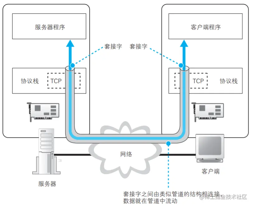 客户端创建套接字后从该套接字延伸出管道到服务器的套接字上