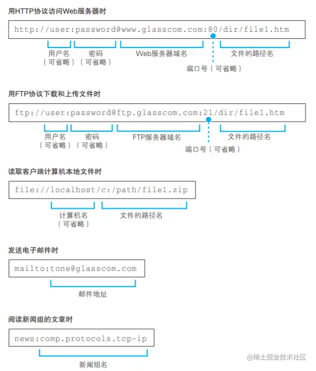 尽管URL有不同的写法,但它们的共同点就是开头的文字:“http:”、“ftp:”、“file:”、“mailto:”这部分文字表示浏览器使用的协议类型或访问方法。