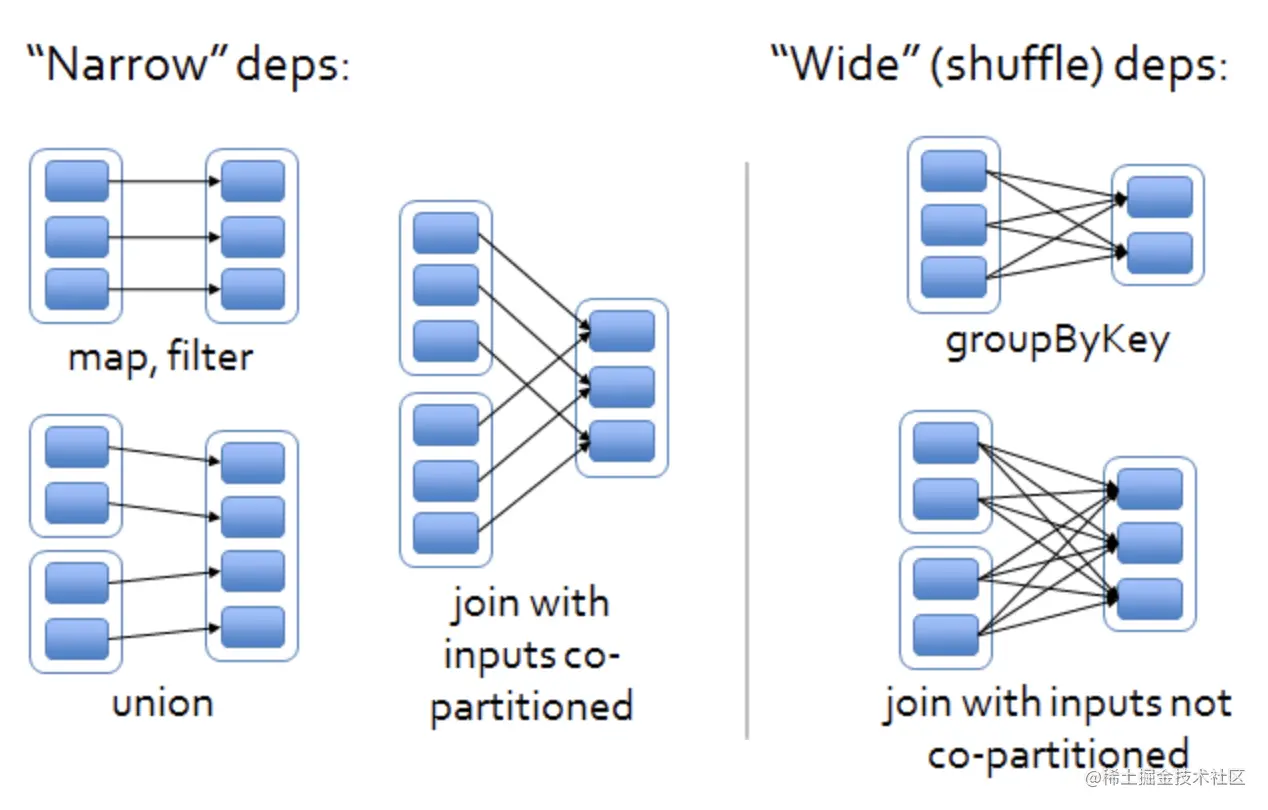 RDD 的每次转换都会生成一个新的RDD,所以RDD 之间就会形成类似于流水线一样的前后依赖关系。在部分分区数据丢失时,Spark 可以通过这个依赖关系重新计算丢失的分区数据,而不是对RDD 的所有分区进行重新计算。